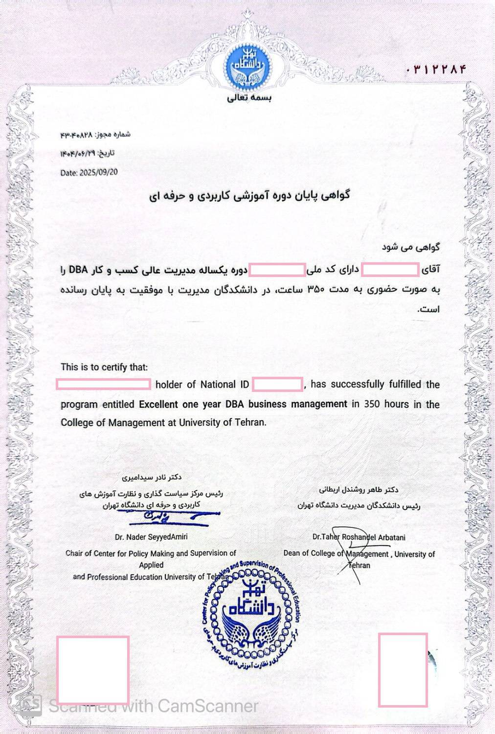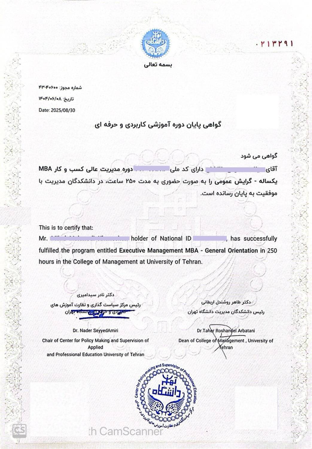 "صدور و تحویل مدارک رسمی از سوی دانشگاه تهران، نشاندهنده اعتبار علمی و کیفیت بالای این دوره است. ما باور داریم که آموزشهای پیشرفته مدیریتی، نهتنها برای ارتقای توانمندی فردی، بلکه برای شکوفایی سازمانها و بنگاههای اقتصادی کشور ضروری است. این تازه آغاز راه است و با قدرت بیشتر مسیر توسعه آموزشهای تخصصی را ادامه خواهیم داد."